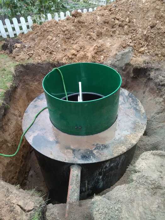 Схема с отводом очищенных сточных вод в фильтрующий колодец. Подходит для хорошо поглощающих грунтов (песок, супесь) и низкого уровня грунтовых вод.